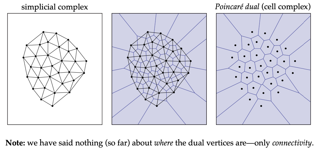 1. **测量通量与环流**:对偶复形的一个重要动机是记录不同类型的测量。在几何和物理问题中,我们常常需要测量通量(如通过某个面的流量)和环流(如沿着某个边的循环流动)。对偶复形提供了一种方便的方式来分别记录这些不同类型的测量,因为原始复形中的元素适合记录环流,而对偶复形中的元素则更适合记录通量。 2. **提供不同视角**:对偶复形为我们理解几何形状和物理现象提供了一个不同的视角。它与原始复形相互补充,帮助我们更全面地分析问题。例如,在研究电磁学问题时,电场通常与原始复形中的边相关,而磁场则与对偶复形中的边相关。二、Dual Mesh—Visualized(对偶网格可视化)