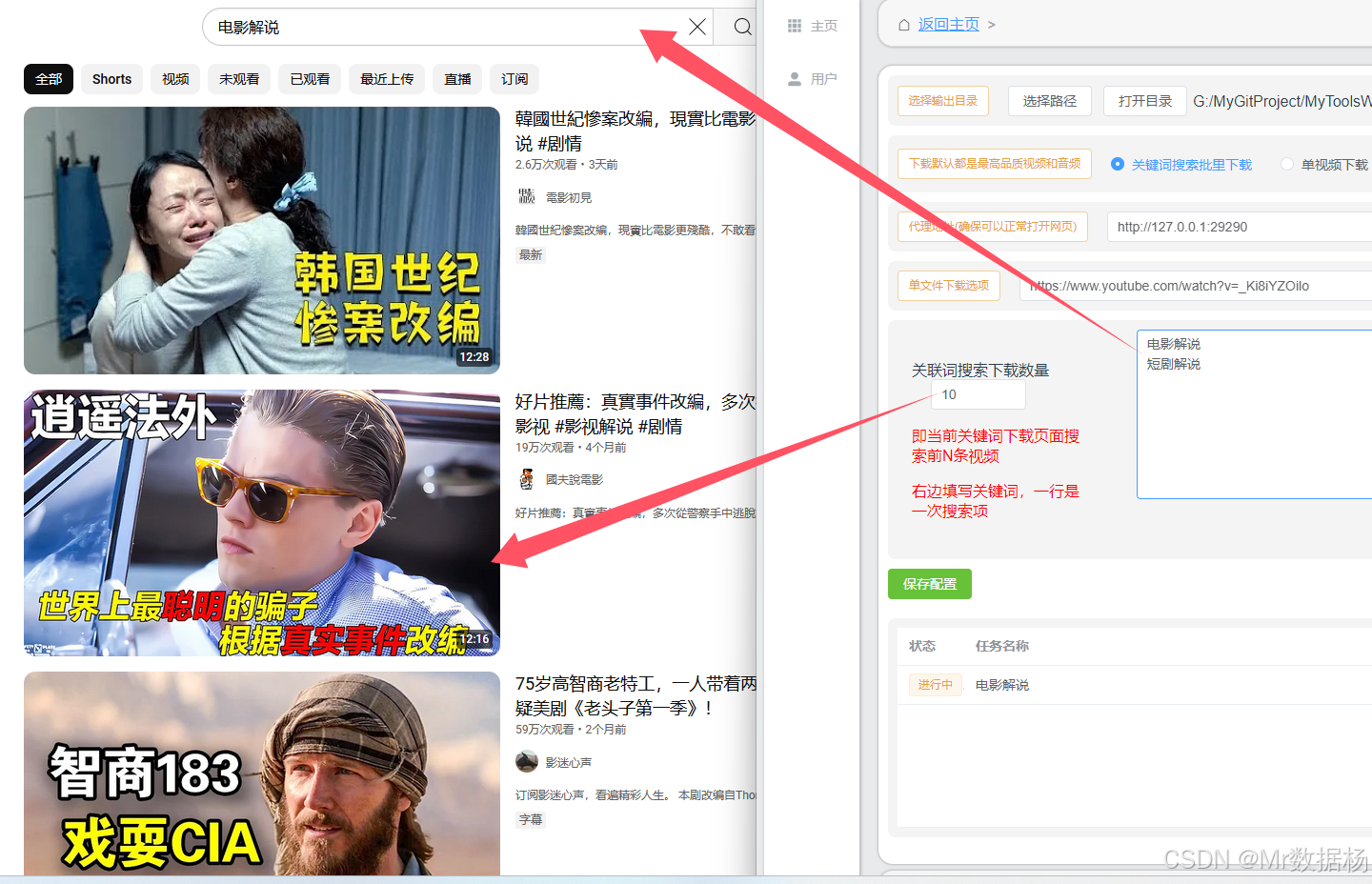 关键词搜索 模式可以是指多个关键词以换行来区分任务,这里几个关键词就会创建几个关键词任务来进行下载,下载数量表示搜索关键词在该搜索页前多少个视频。