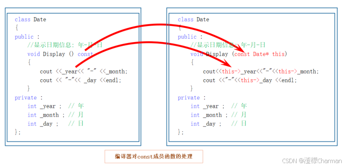 不是const成员函数的话,this指针转递的类型只是Date*类型,不是const Date*类型,所以此时const对象不能调用这个函数,这属于权限放大,是不允许的。而权限缩小可以被允许,所以非const对象也能调用const成员函数。