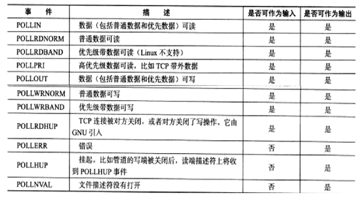 - 输入,输出参数分离(events和revents),不用频繁对poll参数进行重置