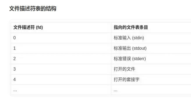 每个进程的文件描述符表是一个数组,数组的索引是文件描述符(fd),数组的值是指向 文件表 中某个条目的指针。