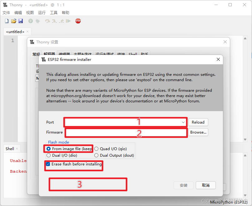 在上图序号2处选择下载的MicroPython固件