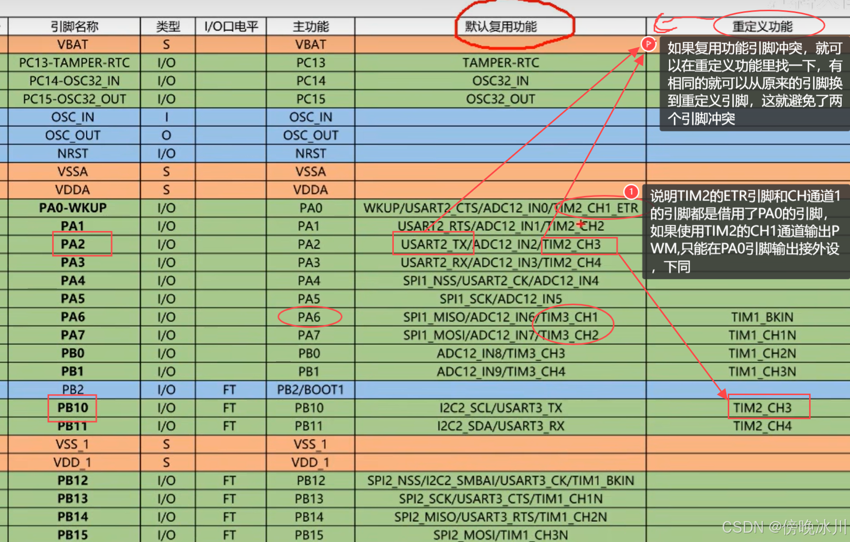 这里的时钟选择,要选择TIM3,也是APB1外设时钟,因为PWM模块还需要TIM2输出PWM,所以要开启TIM3时钟。GPIO初始化需要查看引脚定义表,TIM3通道1对应的是PA6引脚,如果选择其它定时器或者其它通道,那这个引脚就需要根据引脚定义表改变