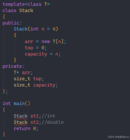 如果要做声明与定义分离,是需要重新写一个模板的,上面那个模板只是Stack类的,下面要再用的话需要重新写一个。