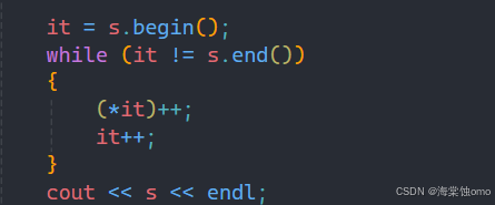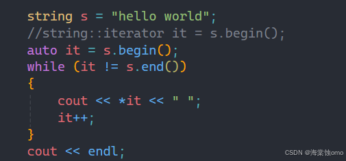 其中的iterator是string类中的一个类型,而begin获得的是字符串的第一个位置,end获得的是字符串最后一个位置的下一个位置,在这里it其实就相当于指针,通过解引用来获取每个字符。