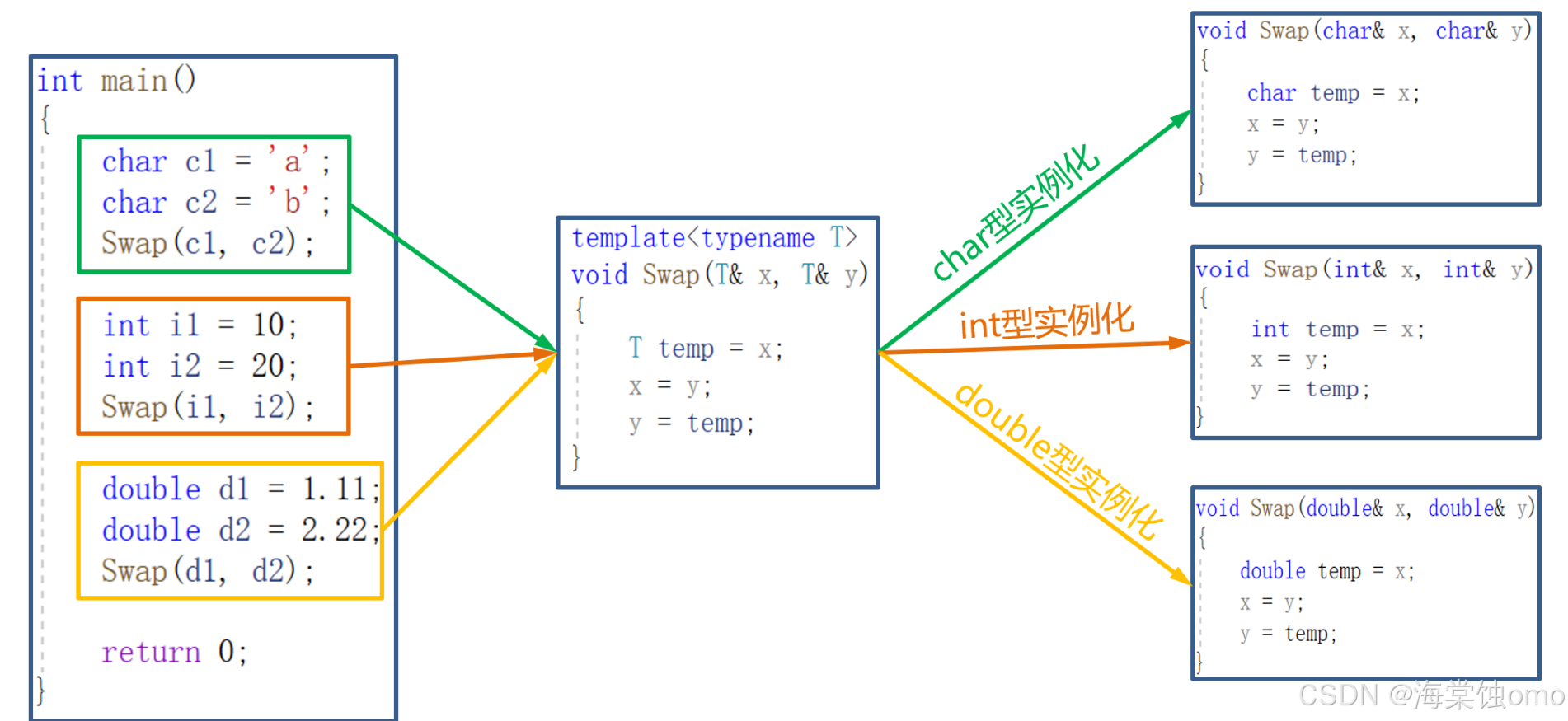 在编译器编译阶段,对于模板函数的使用,编译器需要根据传入的实参类型来推演生成对应类型的函数以供调用。比如:当用double类型使用函数模板时,编译器通过对实参类型的推演,将T确定为double类型,然后产生一份专门处理double类型的代码,对于字符类型也是如此。