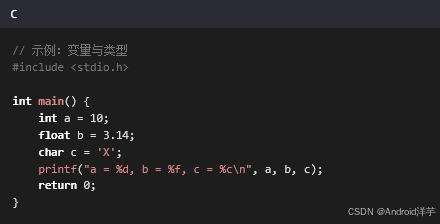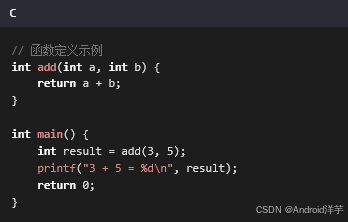 函数是C语言的核心,用于封装可复用的代码块: