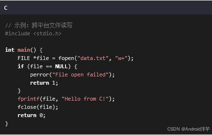 C语言通过ANSI/ISO标准(如C11、C23)确保代码可移植性。例如,使用标准库实现跨平台文件操作: