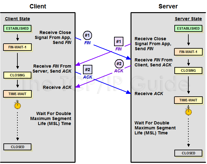 对于四次挥手,实际上可以看作是两次挥手。因为 TCP 是全双工的,所以发送方和接收方都需要发送 FIN 和 ACK。只不过其中一方是被动的,因此看起来像是四次挥手。如果双方同时断开连接,则会进入 CLOSING 状态,最终到达 TIME_WAIT 状态。下图是双方同时断开连接的示意图(您也可以对照 TCP 状态机查看):