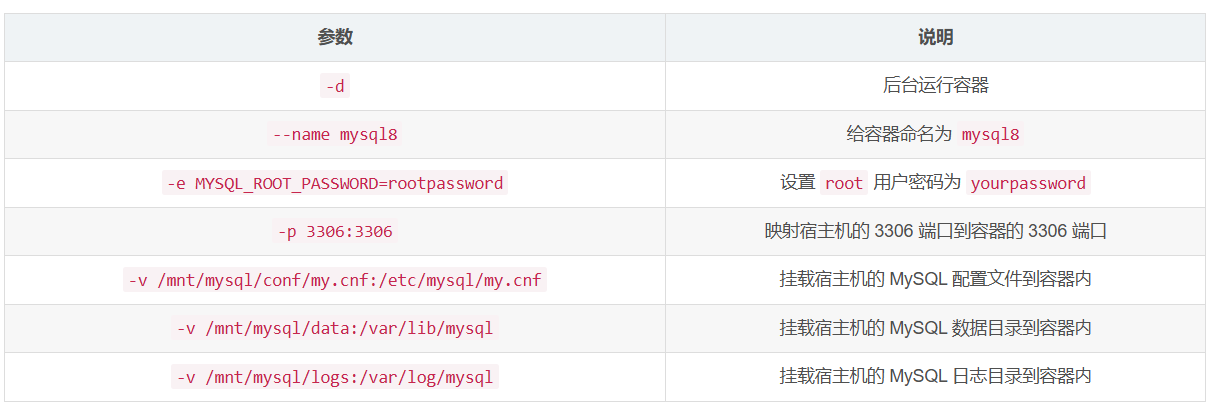 -v -v $PWD/conf:/etc/mysql/conf.d:将主机当前目录下的 conf/my.cnf 挂载到容器的 /etc/mysql/my.cnf。