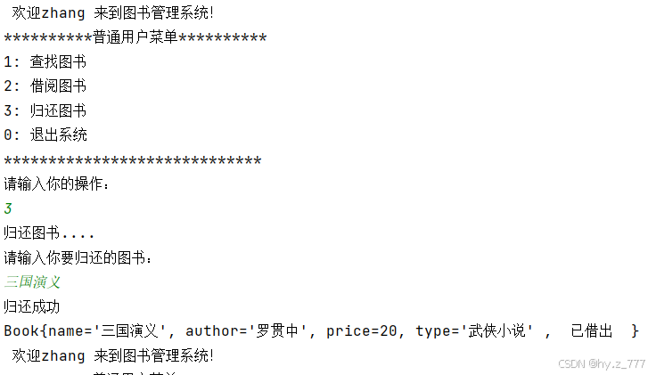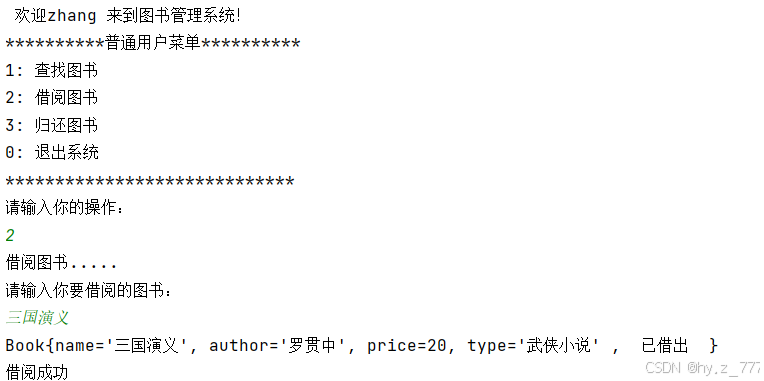 - 4.5 接着4.4的管理员菜单和普通用户菜单,进行操作选择(1查找图书、2借阅图书.....)