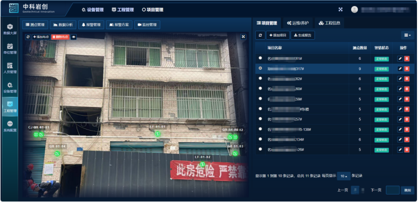 本项目通过岩创可视化云平台观查数据,根据设置报警值,数据变化达到预警值时通过短信、电话等方式及时通知,提供有效预警,使得相关人员可以更加精准地掌握老旧房屋的变化情况,构建一个全面的安全监测体系,以确保老旧小区建筑的稳定性,保障居住人民的人身安全、经济财产损失及周边经营或娱乐设施的建筑安全,我们将持续创新,以提供更有力的技术保障。