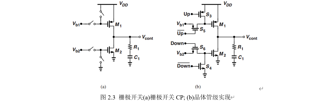 漏极开关和源极开关电荷泵由于开关的导通电阻而遭受一些电压裕度的损失。使用“栅极开关”可以避免这个问题。如图 2.3(a) 所示,这种拓扑结构通过将电流源的栅极连接到偏置电压或它们的源终端。因此,输出可以适应等于 V D D − ∣ V D S 1 , m i n ∣ − V D S 2 , m i n = V D D − ∣ V G S 1 − V T H 1 ∣ − ( V G S 2 − V T H 2 ) V_{DD}-|V_{DS1,min} |-V_{DS2,min}=V_{DD}-|V_{GS1}-V_{TH1} |-(V_{GS2}-V_{TH2}) VDD−∣VDS1,min∣−VDS2,min=VDD−∣VGS1−VTH1∣−(VGS2−VTH2) 的电压范围。“栅极开关”结构也避免可开关的电荷共享问题。