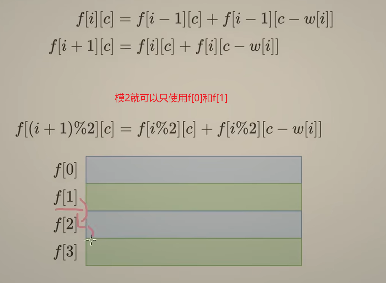 计算了f[i+1],f[i]就没用了,相当于每时每刻只有两个数组在参与运算: