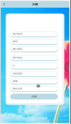 用户注册,在用户注册页面通过填写用户账号、密码、确认密码、用户姓名、性别、手机号码、邮箱、身份证号等信息完成用户注册操作,如图5-3所示。