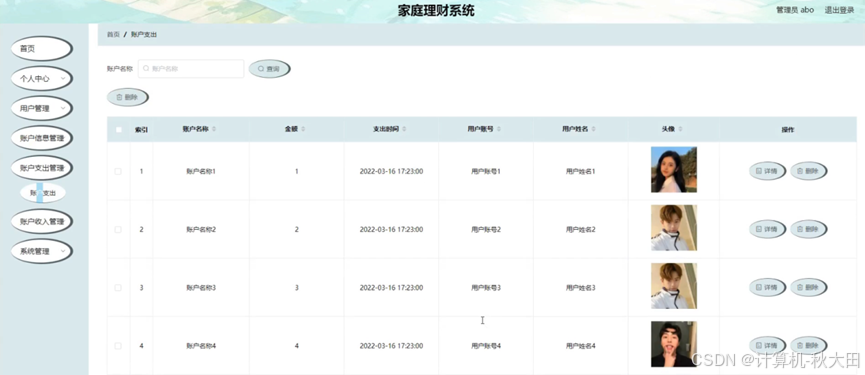 账户支出管理,在账户支出管理页面可以查看索引、账户名称、金额、支出时间、用户账号、用户姓名、头像等内容,并根据需要进行详情,删除等操作,如图5-14所示。