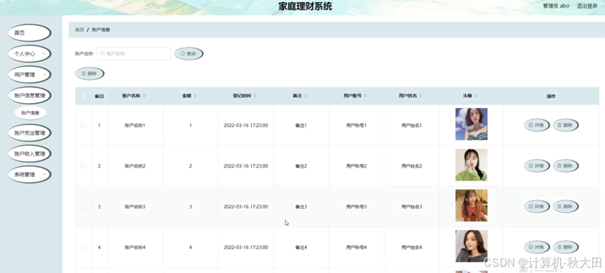 账户信息管理,在账户信息管理页面可以查看索引、账户名称、金额、登记时间、备注、用户账号、用户姓名、头像等内容,并根据需要进行详情,删除等操作,如图5-13所示。