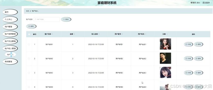 账户收入管理,在账户收入管理页面可以查看索引、账户名称、金额、收入时间、用户账号、用户姓名、头像等内容,并根据需要进行详情,删除等操作,如图5-15所示。