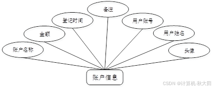 账户信息实体包括账户名称、金额、登记时间、备注、用户账号、用户姓名、头像。账户信息实体图如图4-2所示: