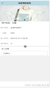 账户收入,在账户收入页面可以查看账户名称、金额、收入时间、用户账号、用户姓名、头像、收入详情等详细内容,如图5-8所示。
