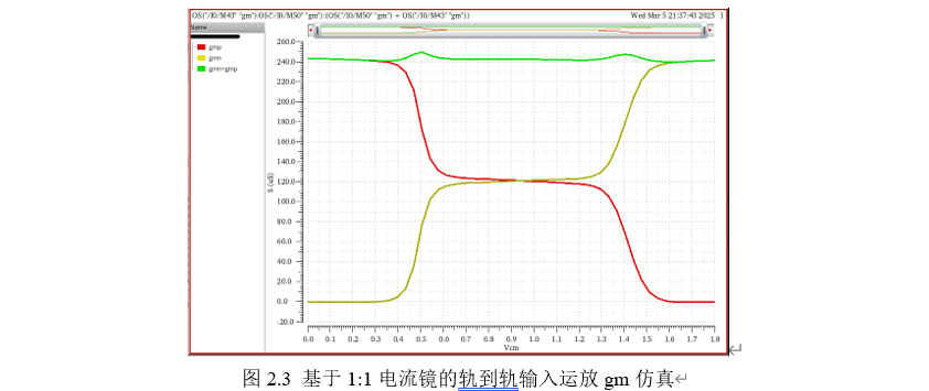 没错,电路结构可以一样,不同的是偏置电路有点区别。1:3电流镜 仍然可以实现恒定跨导,仿真结果如图2.5所示。