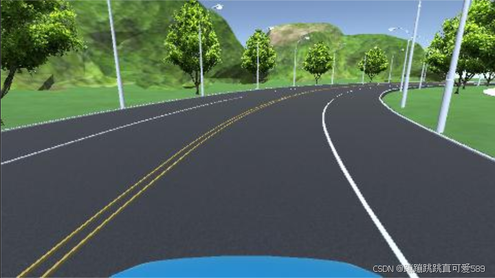 对于道路检测来说,为了方便车辆进行行驶,道路上都有车道线,为了更加方便对道路线进行检测,首先我们要把到路线平视图转变为俯视图,以便后期处理更加方便,如下图所示,该为虚拟场景的驾驶车辆第一人称图。