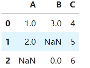 concat dropna 注意:dropna会返回一个新的DataFrame,不会修改原始数据。若想要修改,可以使用inplace=True 默认情况是axis=0,删除包含NaN的行 import pandas as pd df = pd.DataFrame({ 'A':[1,2,None], 'B':[3,None,0], 'C':[4,5,6] }) df.dropna() 2. 删除包含NaN的列 df.dropna(axis=1) 3. 针对特定的列,删除包含NaN的行 df.dropna(subset=['A'])