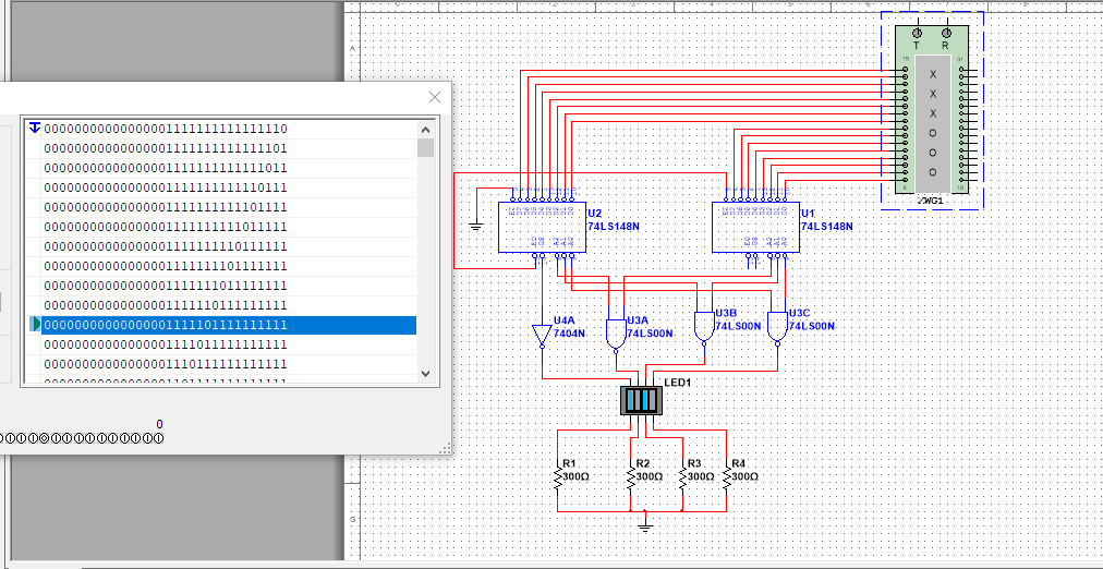 运行该电路,当输入0的引脚是第一个芯片从右向左数第4个,则低8位芯片的引脚D4是有效输入,运行示意图如下所示: