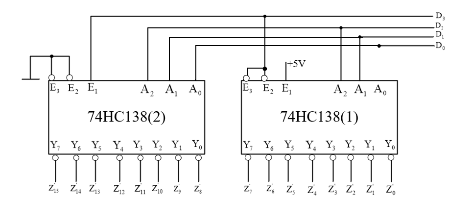 在上一篇的博客中完成了利用Multisim软件实现对于3线-8线译码器,现在同样使用Multisim软件实现4线-16线译码器,其原理图如下所示: