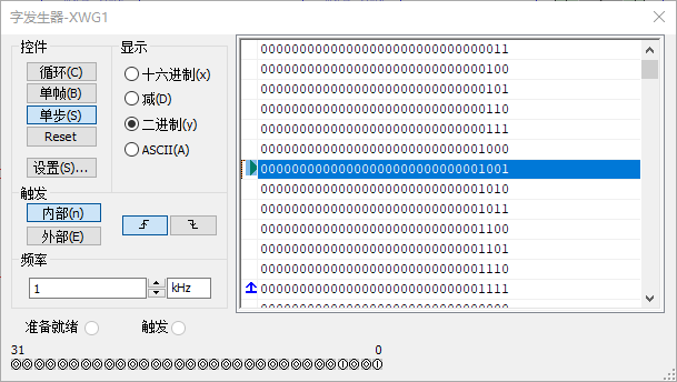 左键点击字发生器,控件点击单步,显示点击二进制,将二进制的范围改为0000~1111,将1111设置为最终位置。如下所示:
