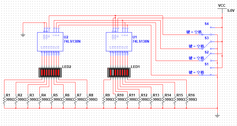 电阻的一端全部接地,另一端接LED的一端,LED的另一端接芯片U1和U2的输出端;四个开关右侧上端全部接电源,下端全部接地,S1、S2、S3个开关的左端接芯片U1和芯片U2的输入端,其中开关S1接芯片U1和芯片U2的引脚A,开关S2接芯片U1和芯片U2的引脚B,开关S3接芯片U1和芯片U2的引脚C,开关S4接芯片U1的引脚~G2A和引脚~G2B、芯片U2的引脚G1;芯片U1的引脚G1接高电平,芯片U2的引脚~G2A、引脚~G2B接地。