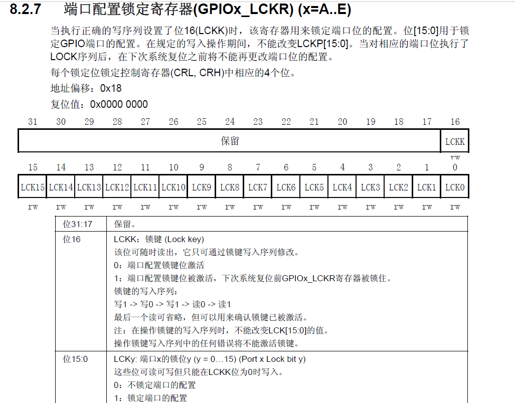 左边还有一个位设置/清除寄存器,这个可以用来单独操作输出数据寄存器的某一位,而不影响其他位。因为这个输出数据寄存器同时控制16个端口,并且这个寄存器只能整体读写,所以如果想单独控制其中某一个端口而不影响其它端口的话,就需要一些特殊的操作方式,第一种方武是先读出这个寄存器。然后用按位与和按位或的方式更改某位,最后再将更改后的数据写回去。在C语言中就是&=和|=的操作。