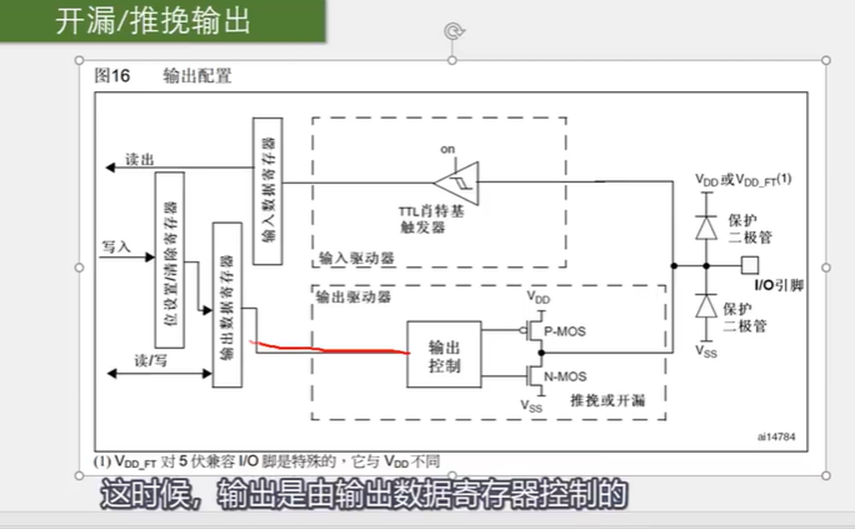 数据寄存器为1时,上管关断,下管导通,输出直接接到VDD,就是输出高电平