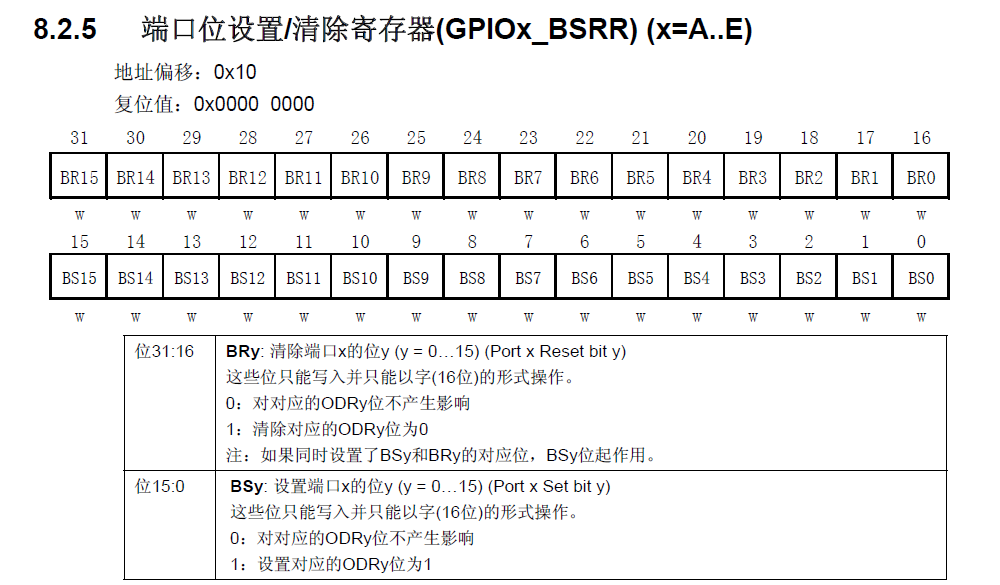 第二种方式是通过设置这个位设置和位清除寄存器, 自动将输出数据寄存器中对应位置为1。而剩下写0的位则保持不变。