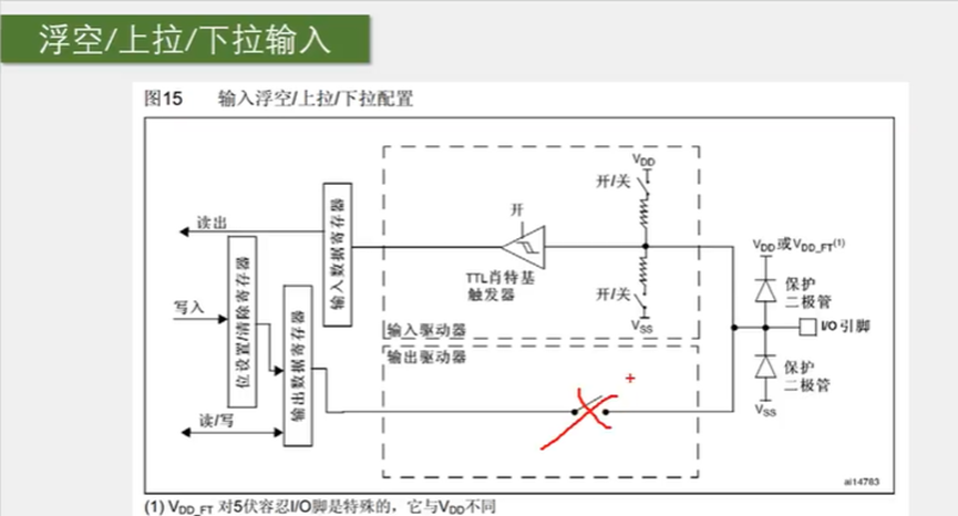 2、上拉电阻至VDD,下拉电阻至VSS,这个开关是可以通过程序进行配置的,上拉输入模式:上面导通,下面关断;下拉输入模式:上面断开,下面导通;两个都断开就浮空输入模式。为了给输入提供一个默认的输入电平的。