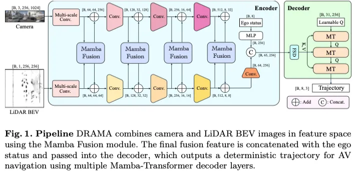 - 我们介绍了一种名为DRAMA的Mamba嵌入式编码器-解码器架构,其中包括一个编码器,该编码器通过Mamba Fusion模块有效地融合了相机和LiDAR BEV图像的特征,解码器通过Mamba Transformer解码器生成确定性轨迹,该解码器普遍适用于任何基于Transformer的模型。