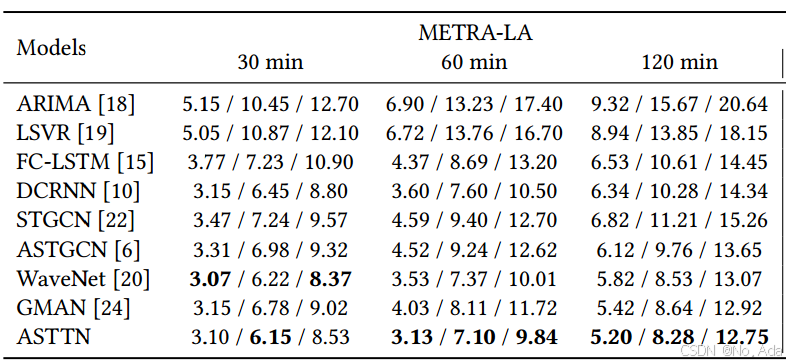 在 METR-LA 和 PEMS-BAY 数据集上进行实验,并在 30 分钟(6 个时间步)、60 分钟(12 个时间步)、120 分钟(24 个时间步) 这三种时间跨度下,对 ASTTN 和基线模型的性能进行了比较。