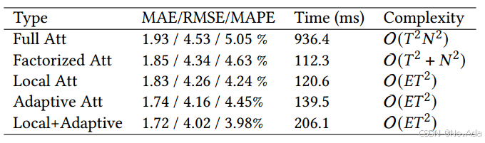 需要注意的是,该方法在时间维度上保留了完整的注意力计算(𝑇 个时间步),可以建模长距离的时间交互,相比于时间滑动窗口方法(temporal sliding window approach)仅考虑相邻时间步的情况,该方法具有更强的时序建模能力。该方法的时间复杂度为 O(𝐸𝑇²),对于稀疏图是可扩展的,其中 𝐸 代表空间图中的总边数。