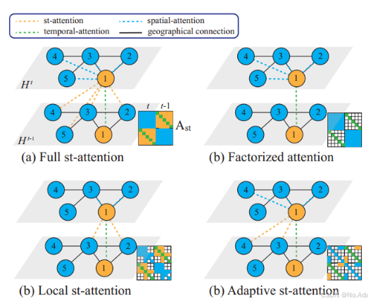 处理时空数据需要在空间和时间域上建模其相关性。将相同时间步(或位置)内节点之间的注意力称为空间注意力(spatial-attention)或时间注意力(temporal-attention),而对于同时具有不同时间步和不同位置的节点对之间的注意力,我们称之为时空注意力(st-attention)。