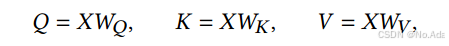 其中,𝑊𝑄, 𝑊𝐾 ∈ R^(𝐷×𝐷𝑄𝐾),𝑊𝑉 ∈ R^(𝐷×𝐷𝑉),查询矩阵 𝑄 和键矩阵 𝐾 维度相同(𝐷𝑄𝐾),而值矩阵 𝑉 维度为 𝐷𝑉,通常我们设定 𝐷𝑄𝐾 = 𝐷𝑉。