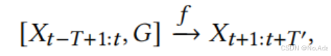 给定一个图 𝐺 以及历史 𝑇 个时间步的特征矩阵,交通预测的目标是学习一个函数 𝑓,能够预测未来 𝑇′ 个时间步的特征矩阵。