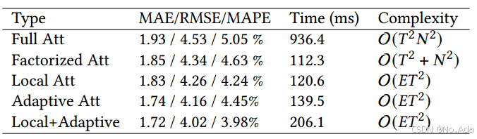 如图 1(a) 所示,将空间和时间注意力融合的最直接方式是对时空图中的每对节点计算注意力(即完全时空注意力)。这种方法能够捕获在空间和时间域上距离较远的两个节点之间的注意力关系,但其时间复杂度为O(𝑇²𝑁²),随着𝑁 的增长,无法扩展到大规模图数据。