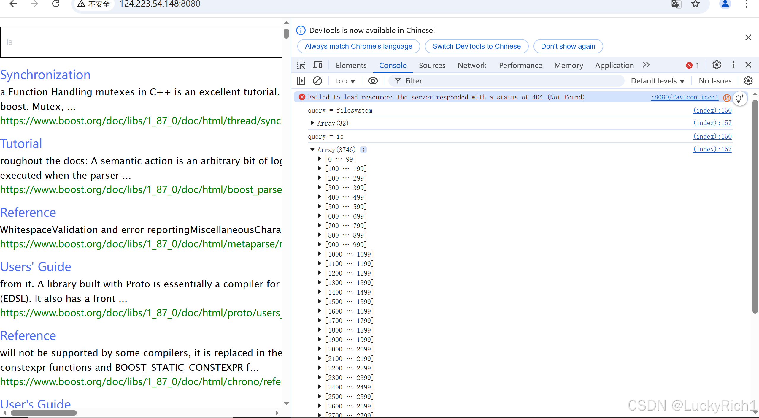 比如如果你在当前搜索引擎搜索关键字 is,明明是一个boost搜索引擎,你搜它根本没有意义,更何况一个html文件中有很多is,确实没有意义。就拿目前的代码来运行搜索关键字 filesytem是有意义的。