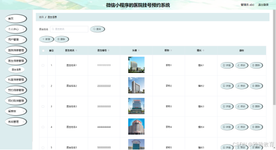 如图5.3显示的就是医生管理页面,管理员可以对医生信息进行添加,修改,删除,查询操作。