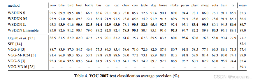 我们还对比了采用4级空间金字塔池化{6×6,3×3,2×2,1×1}的SPP-net[14](基于Overfeat-7[27]的全监督检测框架)。虽然未进行微调,但其空间池化层在PASCAL VOC 2007分类任务中达到82.4%的最佳性能。最后,WSDDN L与高性能VGG-VD16[28]对比——后者同样通过多位置多尺度的全连接层激活聚合来利用粗粒度局部信息。值得注意的是,WSDDN L以0.4个百分点的优势超越这一强劲基线。