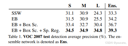 我们进一步比较两种主流物体提议方法SSW[32]和EB[37]的检测性能。虽然两种区域提议质量相当,但利用EB的边界框分数(表1中记为Box Sc)使S/M模型提升2%mAP,L模型提升达5%。