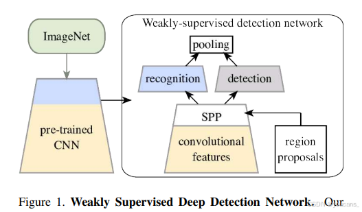 本文提出一种基于预训练CNN的端到端弱监督目标检测方法——弱监督深度检测网络(WSDDN)(图1)。