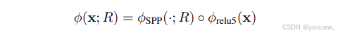 (1)首先,我们将最后一个卷积块(通常称为relu5和pool5)中紧接ReLU层后的最后一个池化层替换为空间金字塔池化(SPP)层[19,14]。这将产生一个以图像x和区域(边界框)R作为输入,并输出特征向量或表示