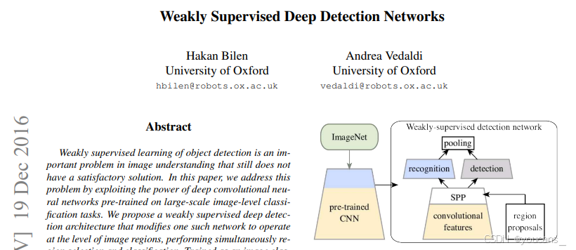 2016年,牛津大学 H. Bilen 等发表论文 “Weakly Supervised Deep Detection Networks(弱监督深度检测网络)”,是 弱监督检测领域 的开山之作。
