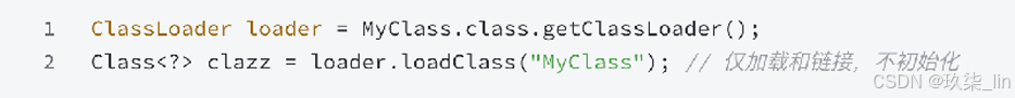 ① 触发加载但不初始化:使用ClassLoader.loadClass() 可加载类但不初始化: